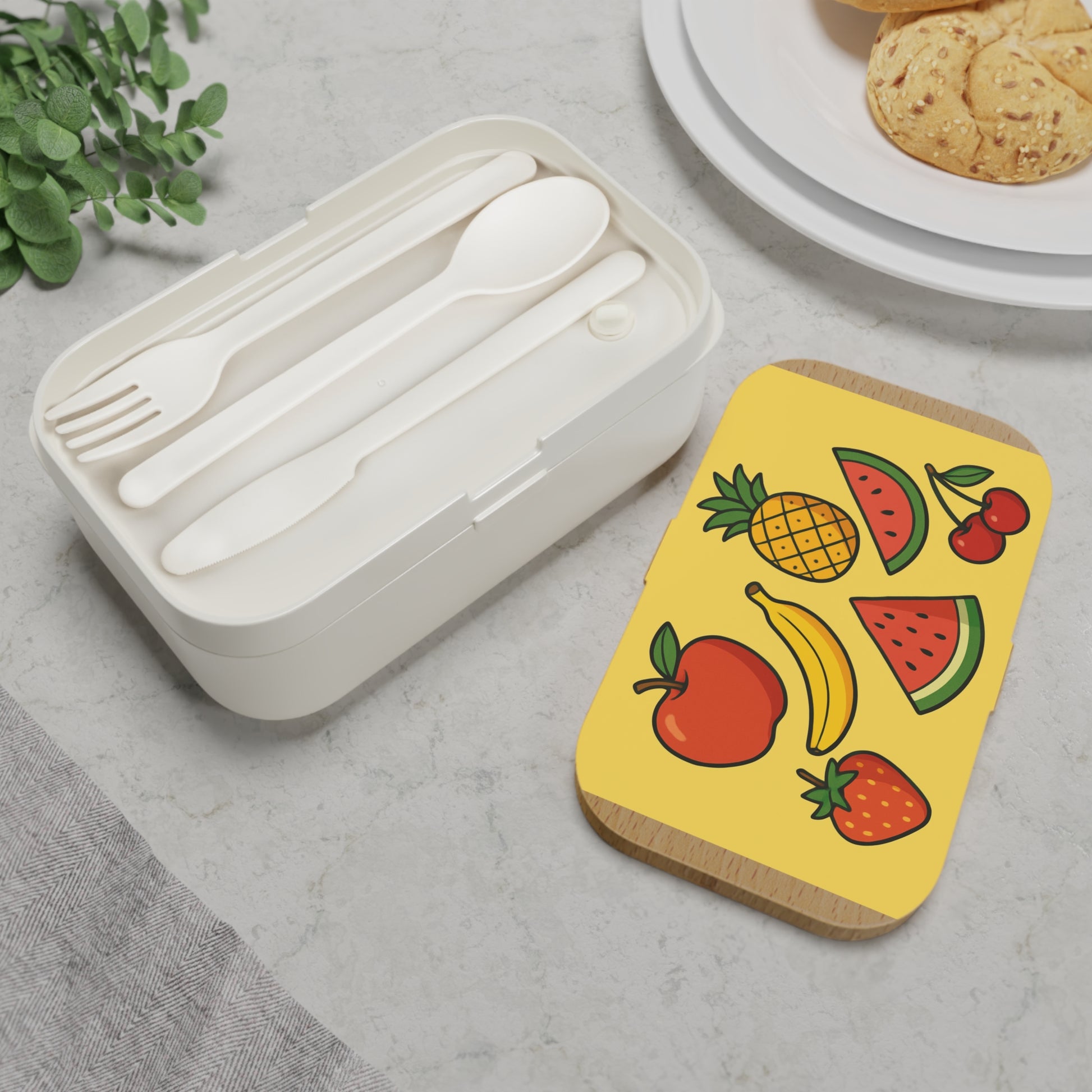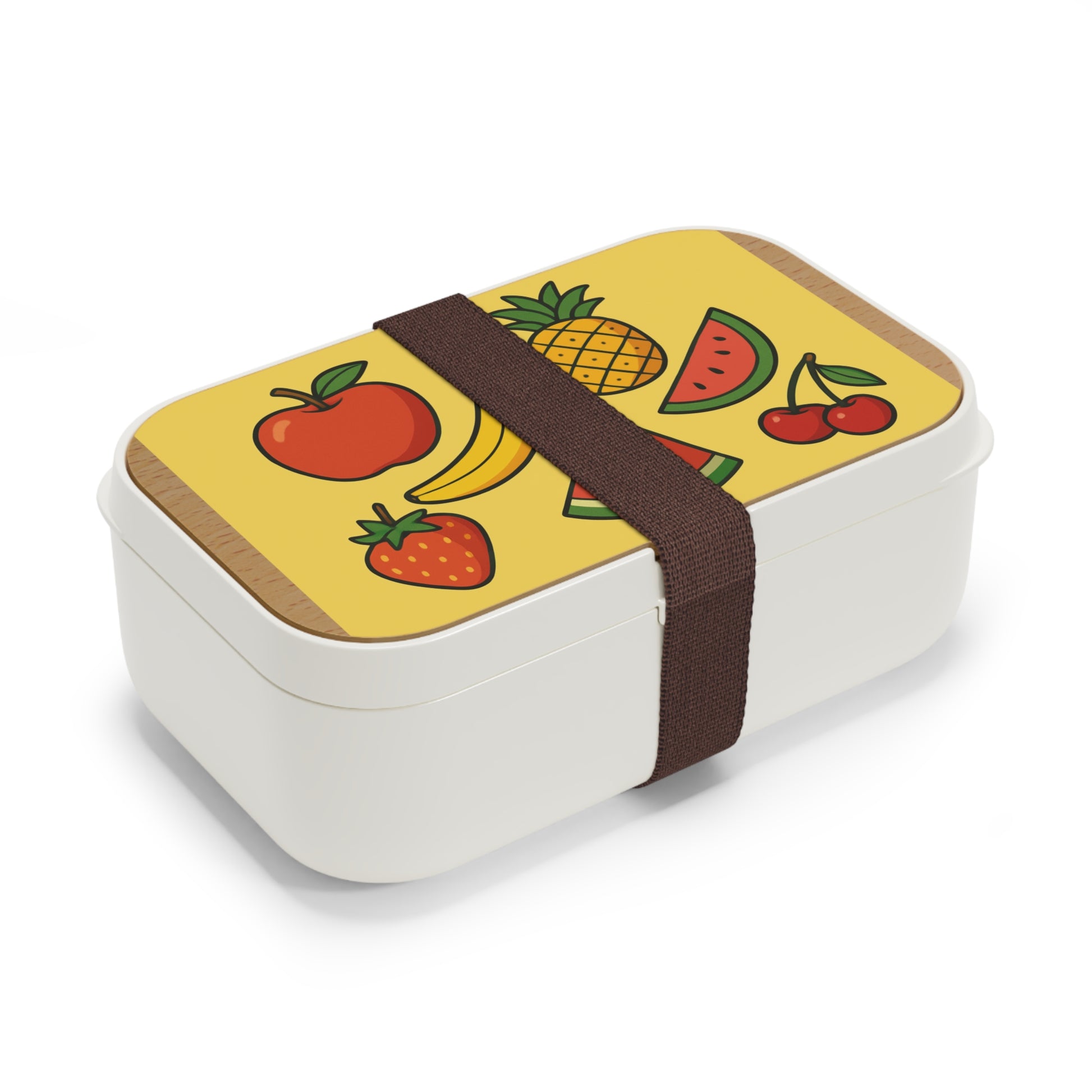 Dieses fröhliche Obstmotiv bringt gesunde Energie auf deine Lunchbox! Saftige Wassermelonen, eine süße Erdbeere, ein knackiger Apfel, eine sonnengelbe Banane, reife Kirschen und eine exotische Ananas leuchten in kräftigen Farben vor einem hellen Hintergrund. Perfekt für alle, die frisches Obst lieben und ihre Lunchbox mit einem sommerlichen, vitaminreichen Look verschönern möchten.