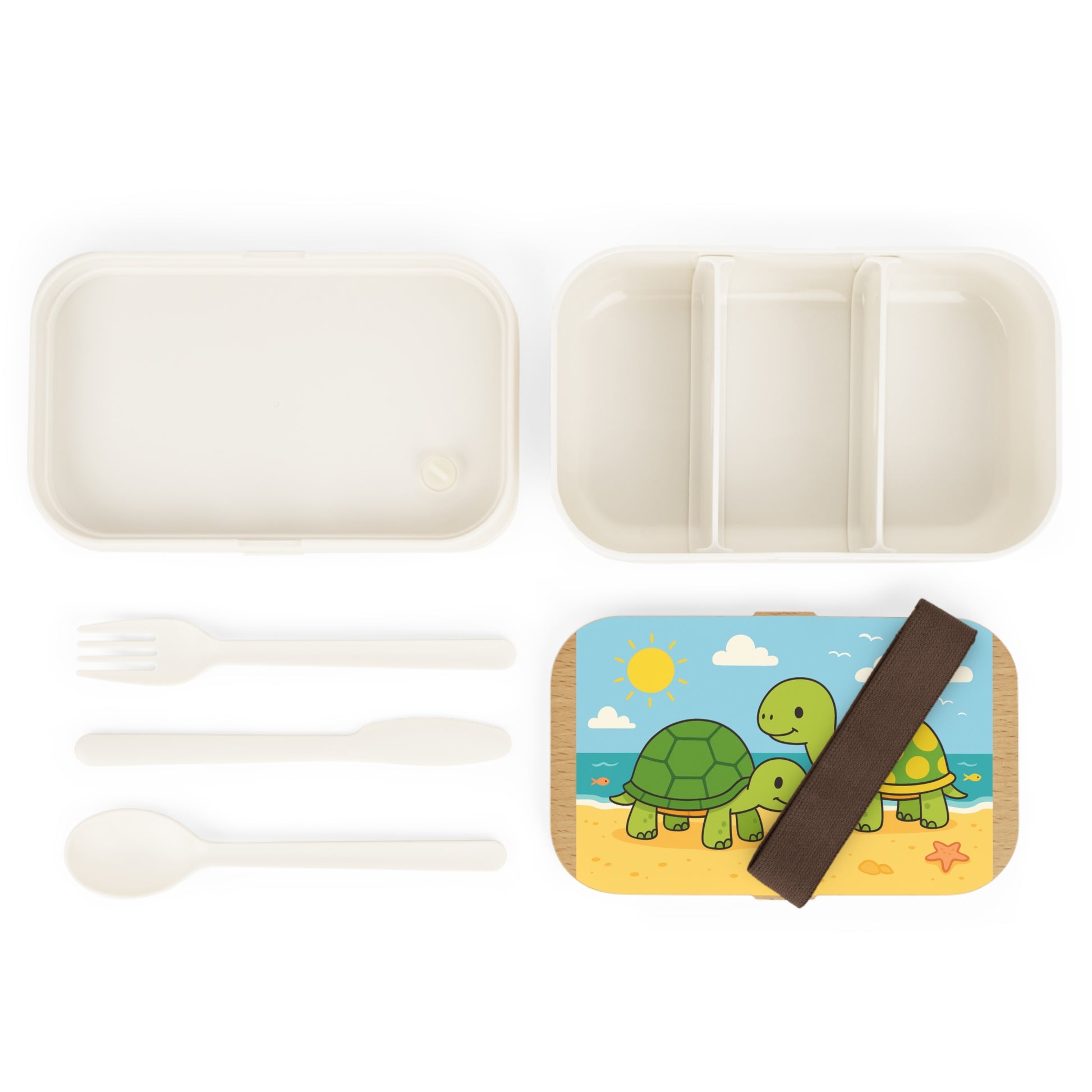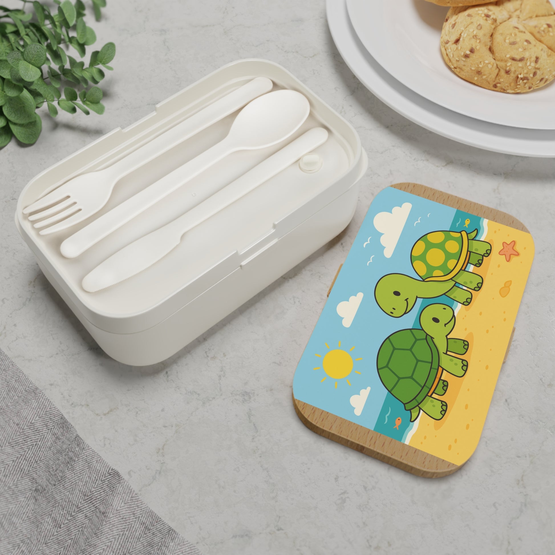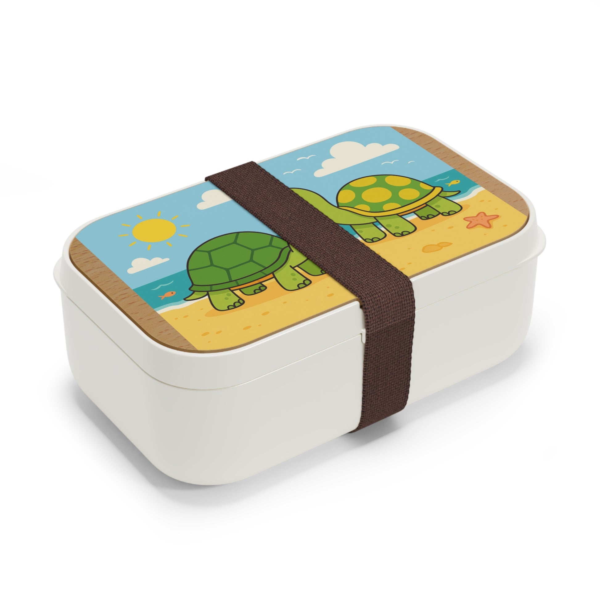 Dieses sommerliche Schildkrötenmotiv bringt Strandfeeling auf deine Lunchbox! Zwei fröhliche Schildkröten spazieren am goldenen Sandstrand entlang, während Sonne, Meer und bunte Details wie Fische und Seesterne die Szene abrunden. Perfekt für alle, die Meer, Natur und verspielte Designs lieben.