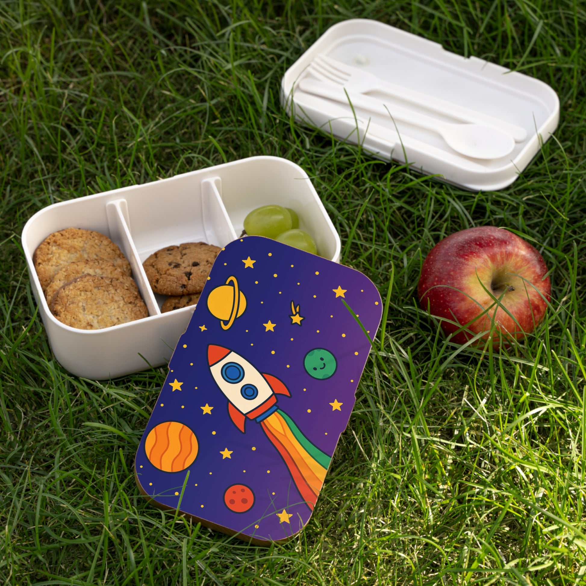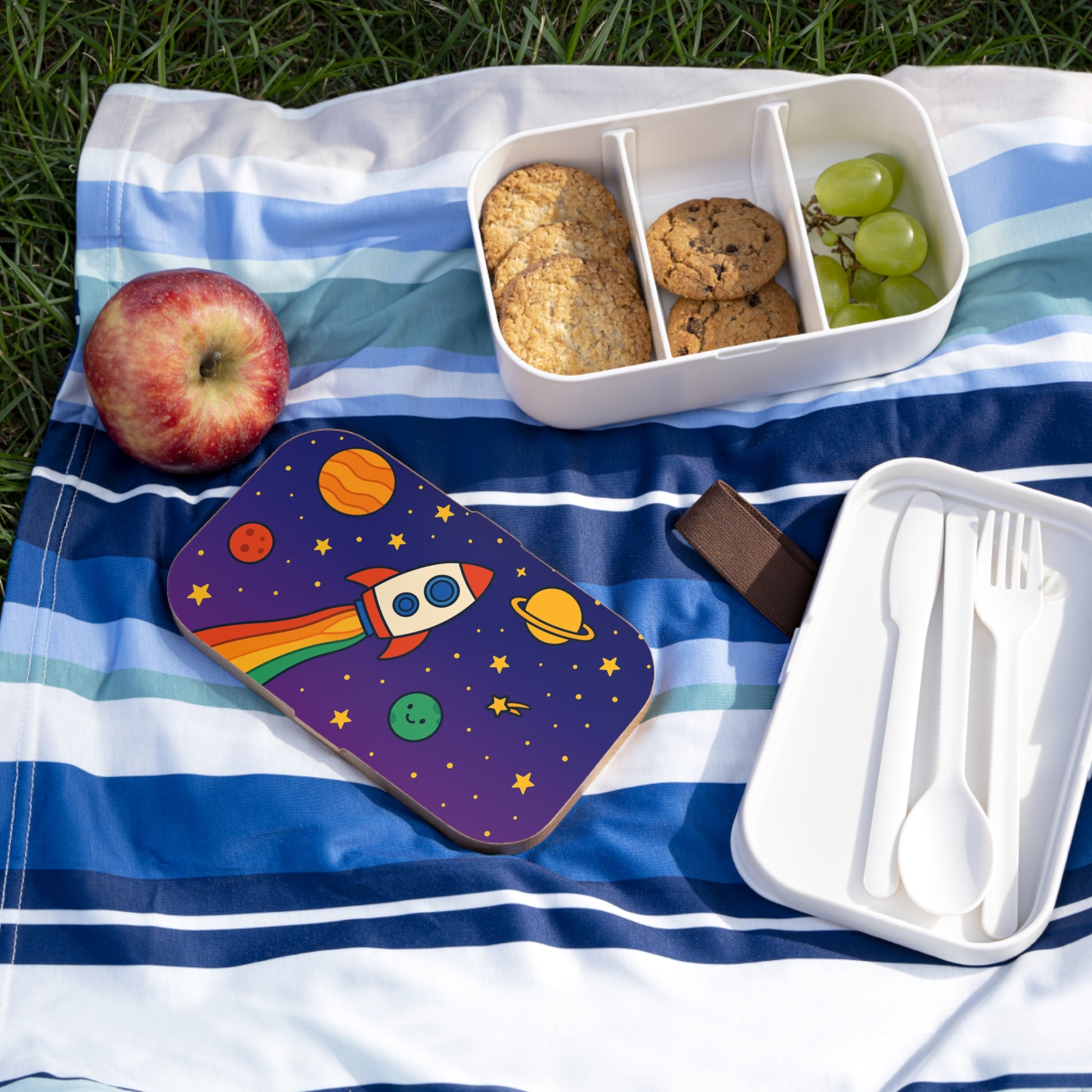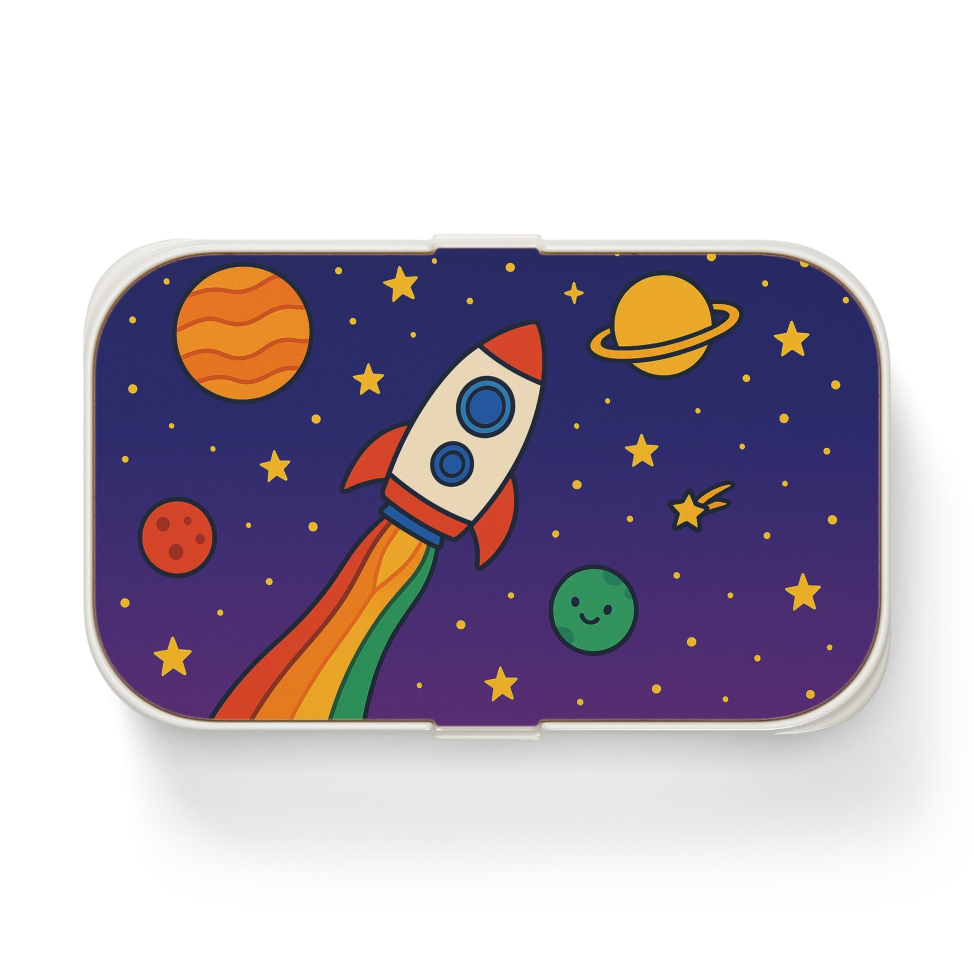 Dieses farbenfrohe Raketenmotiv bringt Abenteuerlust direkt auf deine Lunchbox! Die weiße Rakete mit roter Spitze rast durch ein tiefblaues Weltall, begleitet von strahlenden Sternen, bunten Planeten und einem Regenbogen-Schweif. Perfekt für kleine und große Entdecker, die ihre Pause mit einem Hauch von Fantasie und guter Laune genießen möchten.