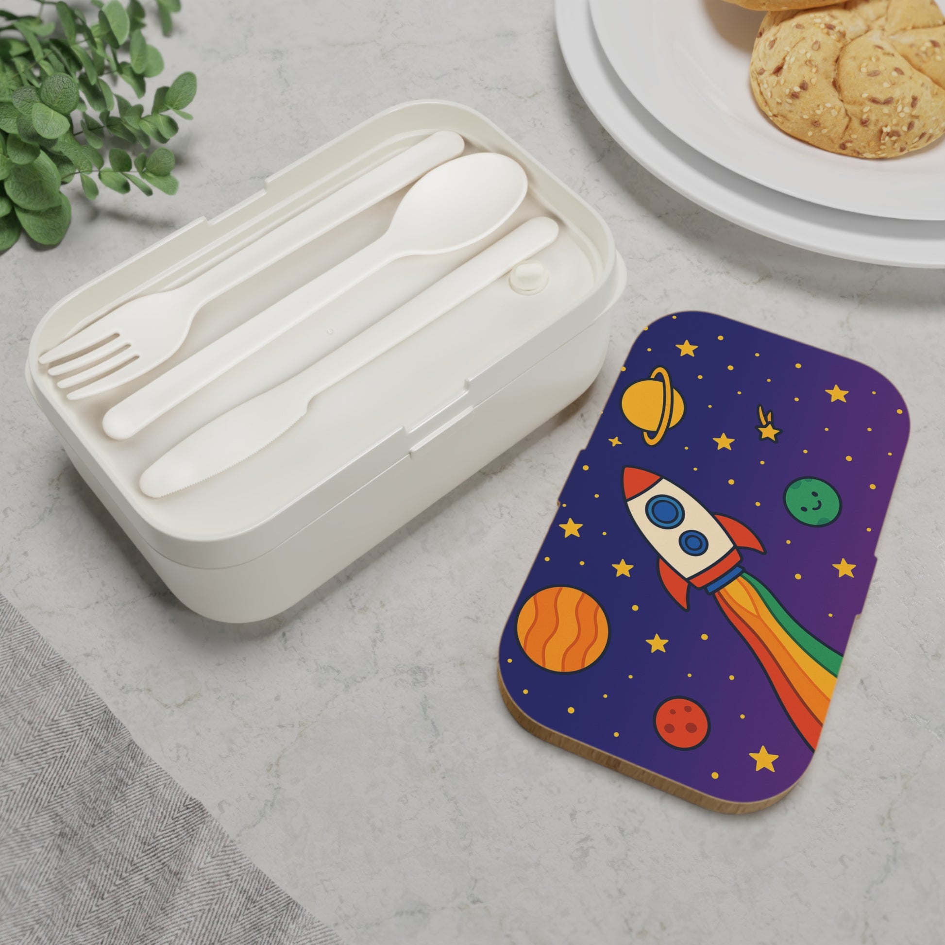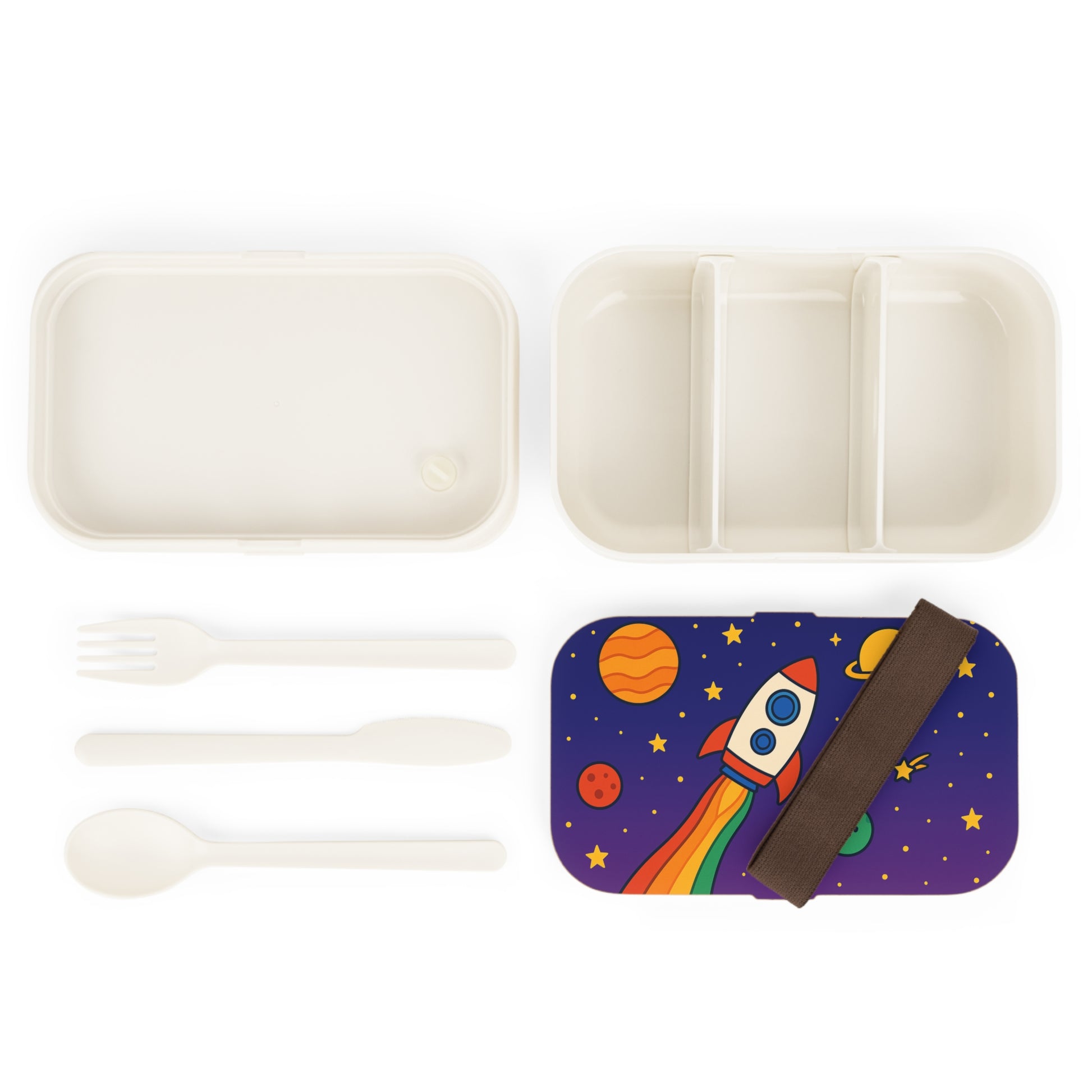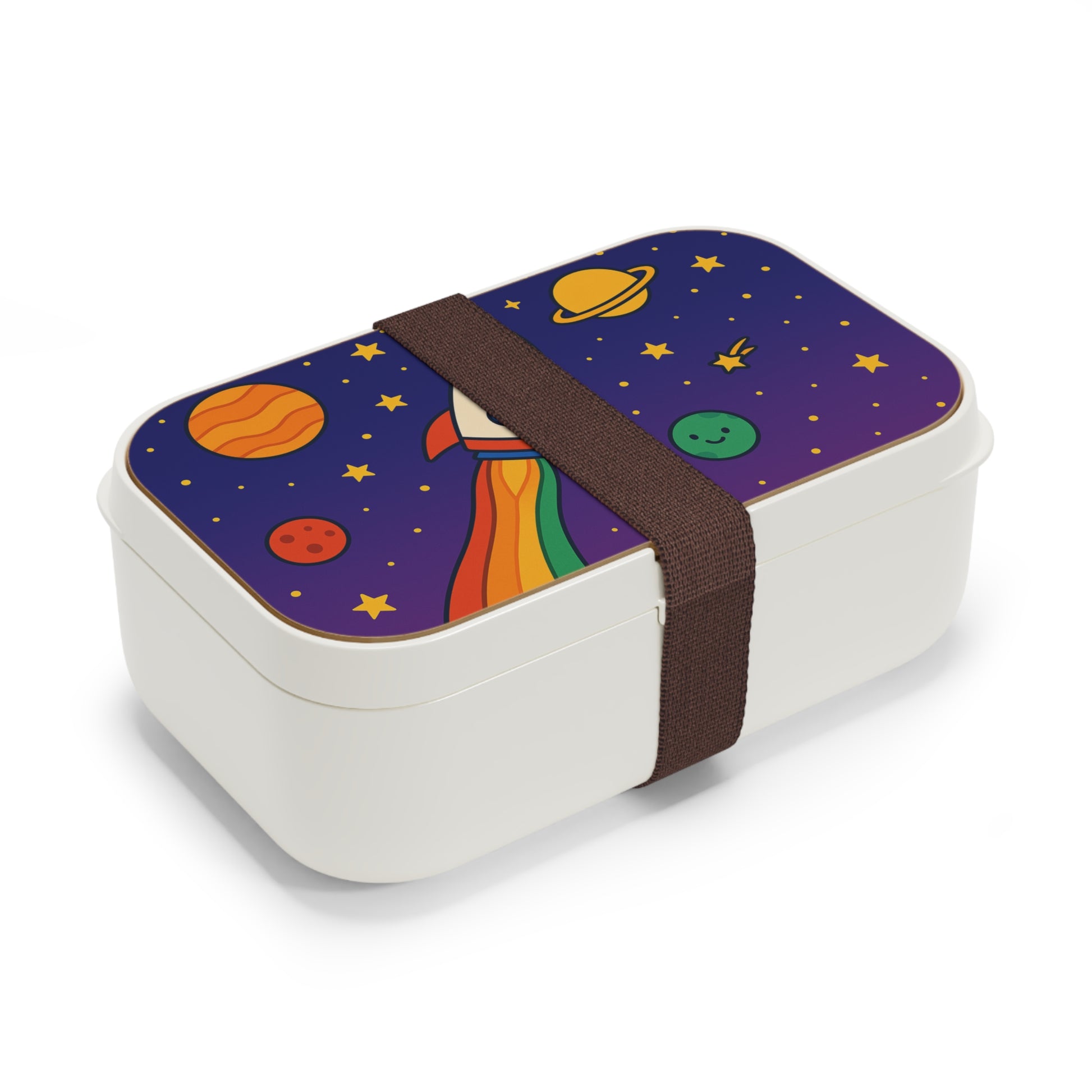 Dieses farbenfrohe Raketenmotiv bringt Abenteuerlust direkt auf deine Lunchbox! Die weiße Rakete mit roter Spitze rast durch ein tiefblaues Weltall, begleitet von strahlenden Sternen, bunten Planeten und einem Regenbogen-Schweif. Perfekt für kleine und große Entdecker, die ihre Pause mit einem Hauch von Fantasie und guter Laune genießen möchten.
