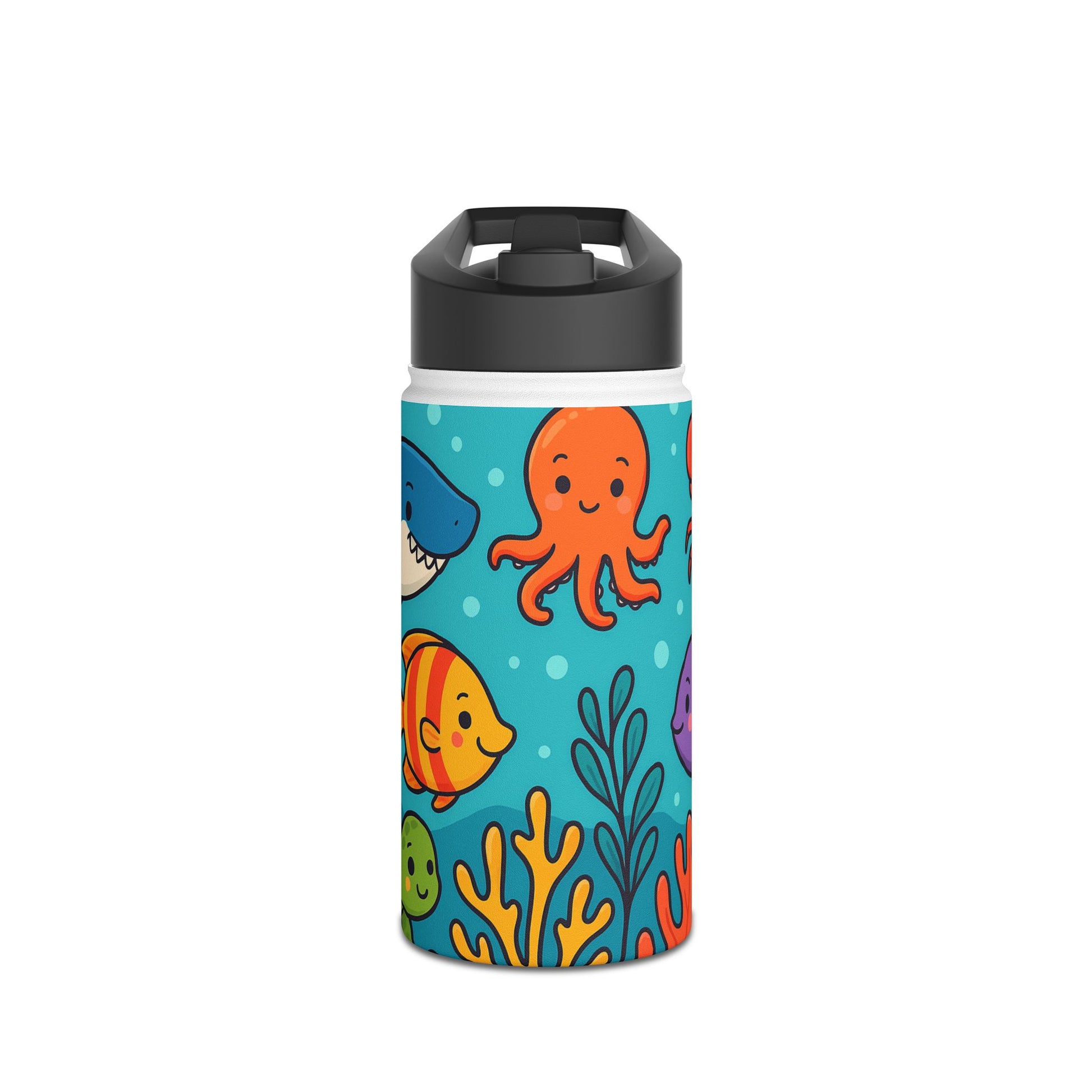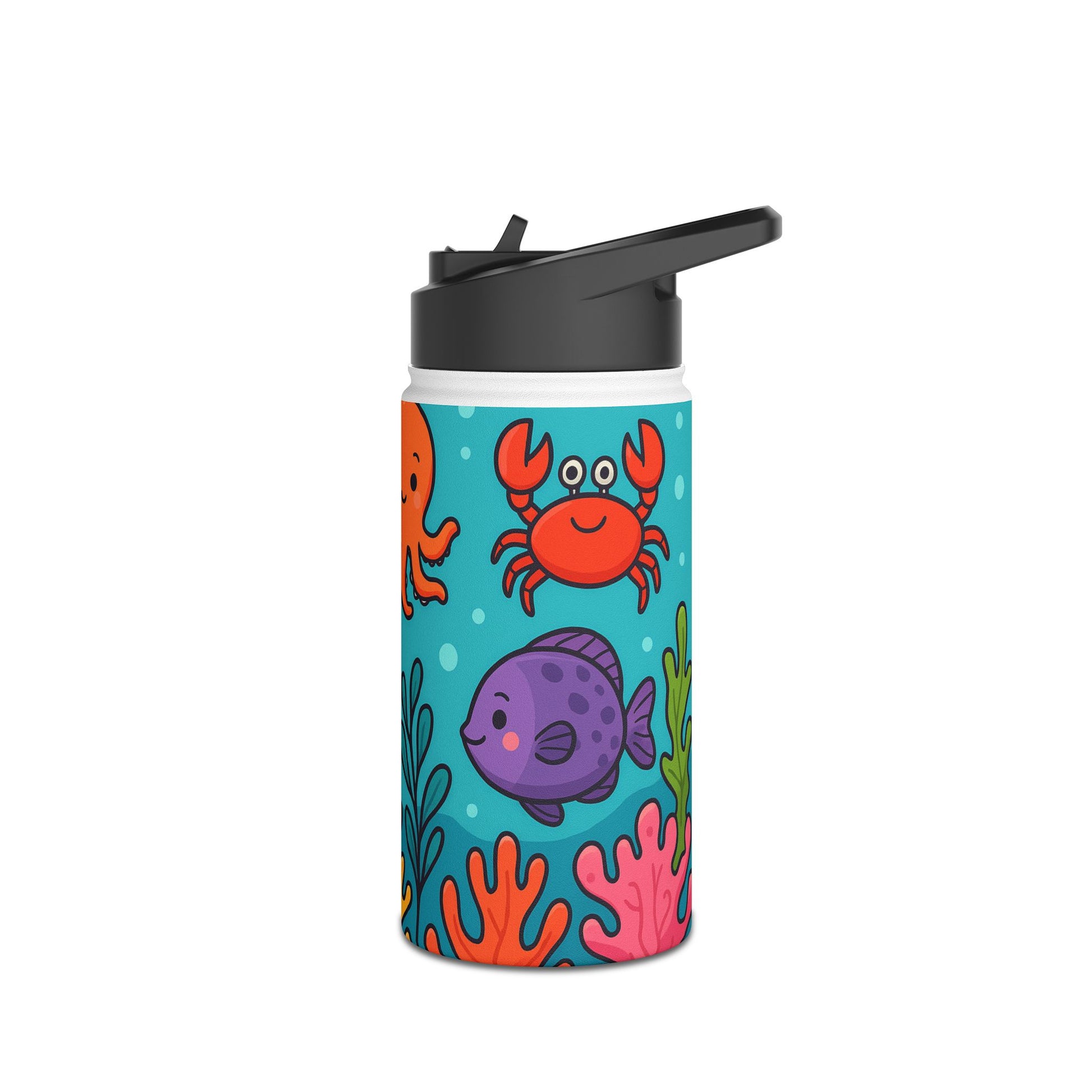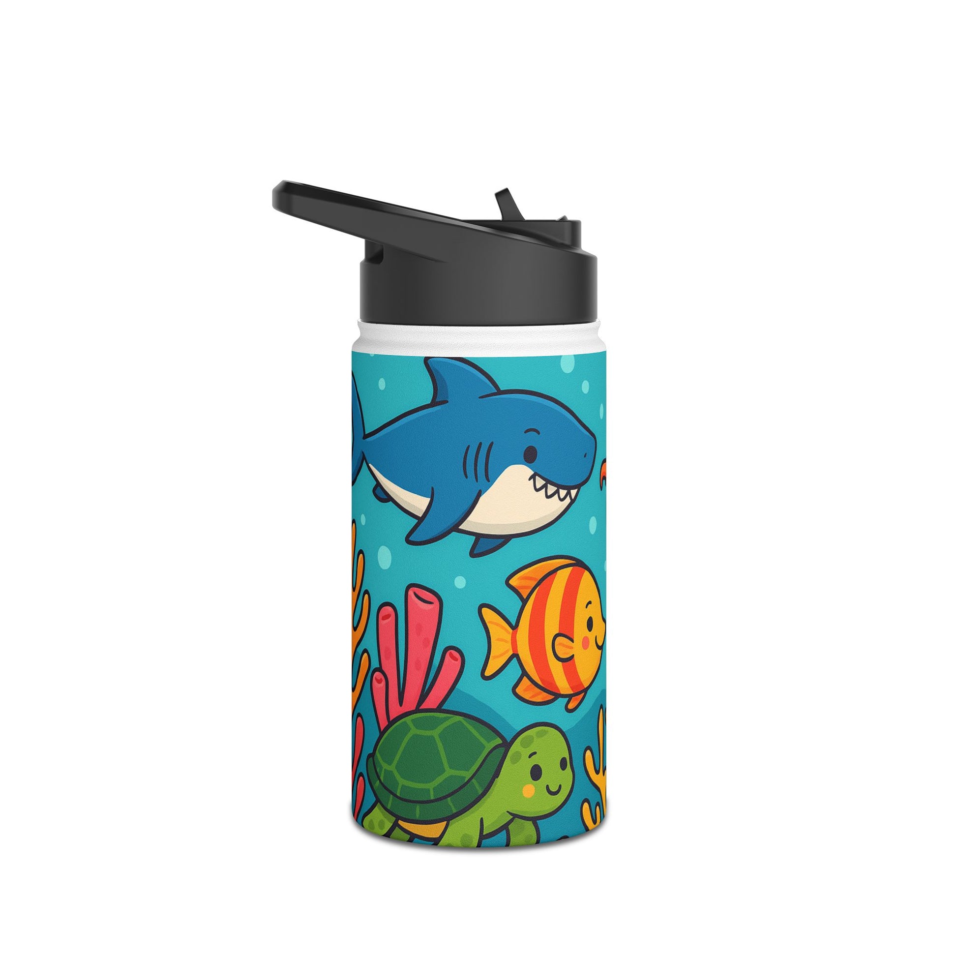 Tauche ein in die farbenfrohe Unterwasserwelt! Dieses verspielte Motiv zeigt fröhliche Meerestiere – darunter Fische, Schildkröten und bunte Korallen – in einem lebendigen Comic-Stil. Perfekt für Kinder und Erwachsene, die das Meer lieben und ein frisches, auffälliges Design suchen. Ideal geeignet für Trinkflaschen, die sofort Urlaubsstimmung und gute Laune verbreiten.