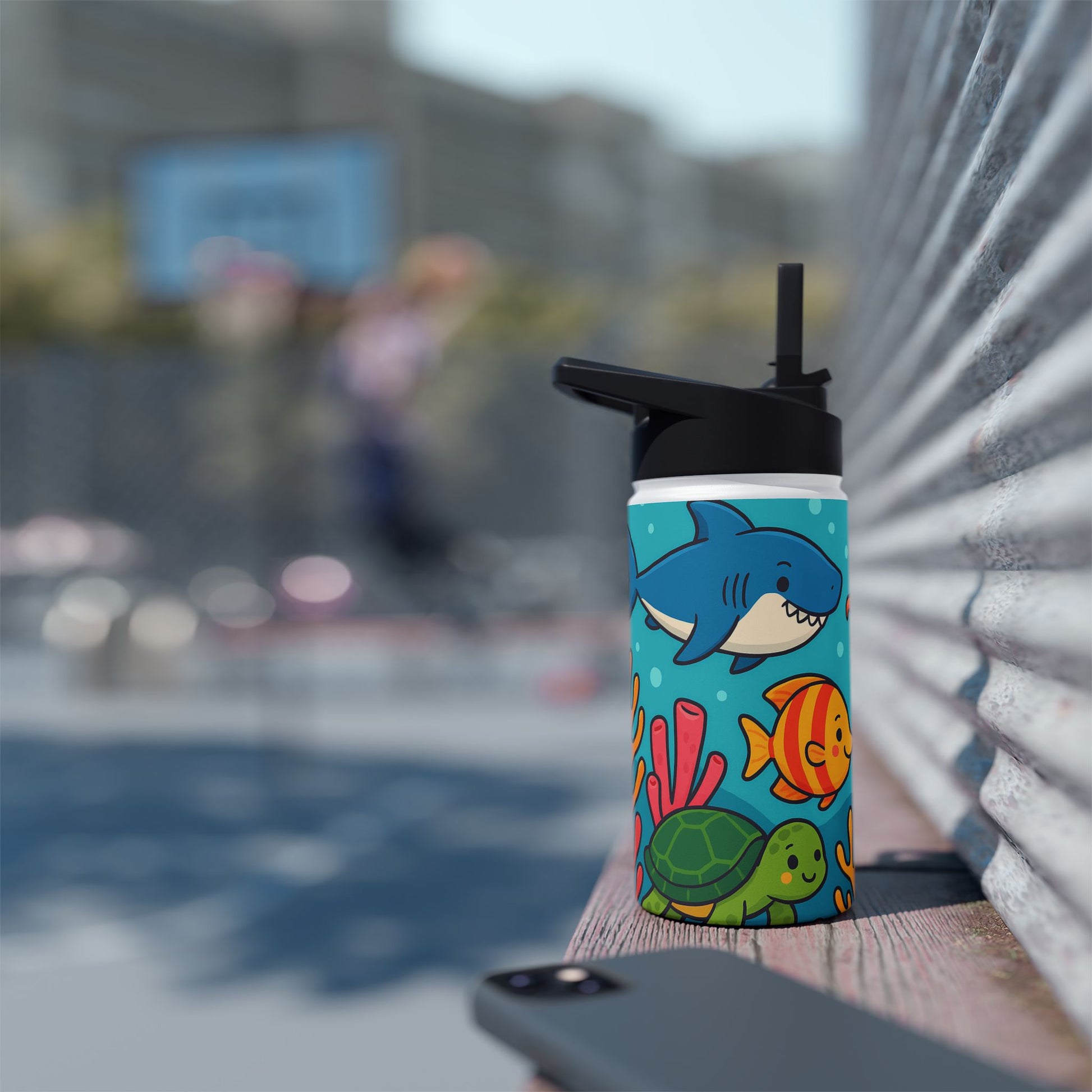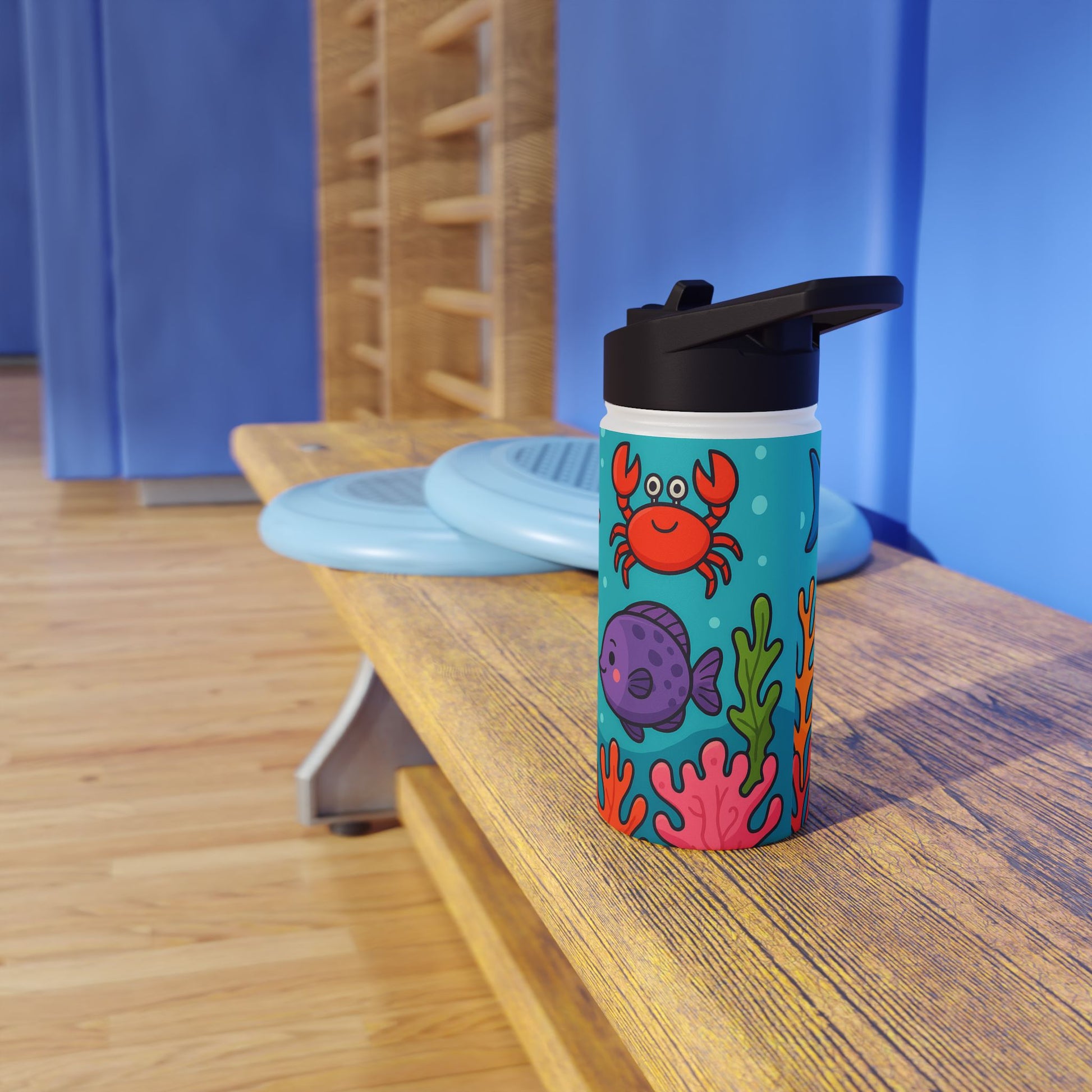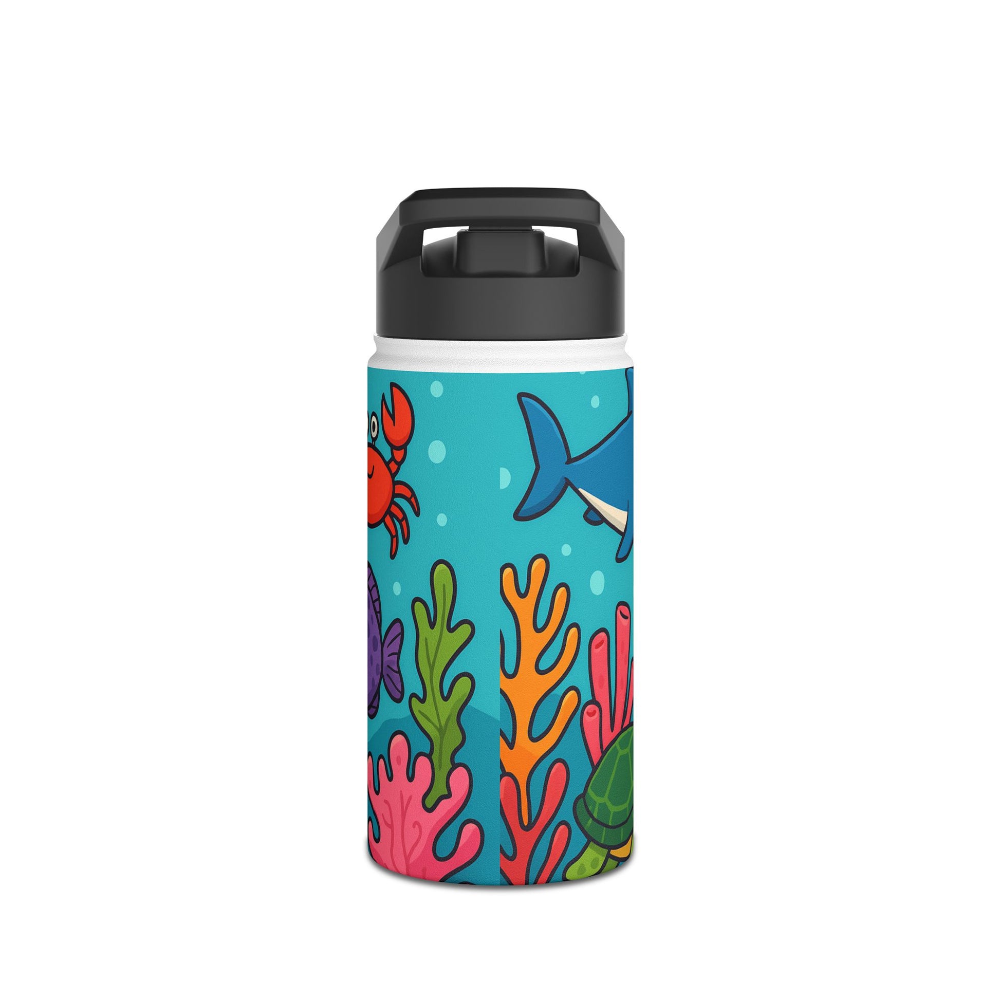 Tauche ein in die farbenfrohe Unterwasserwelt! Dieses verspielte Motiv zeigt fröhliche Meerestiere – darunter Fische, Schildkröten und bunte Korallen – in einem lebendigen Comic-Stil. Perfekt für Kinder und Erwachsene, die das Meer lieben und ein frisches, auffälliges Design suchen. Ideal geeignet für Trinkflaschen, die sofort Urlaubsstimmung und gute Laune verbreiten.